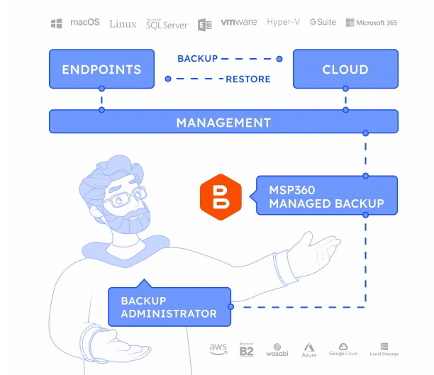 MSP360 Managed Backup is an easy-to-use solution with centralized management, monitoring, reporting and free web-based remote access. MSP360 Backup and IT management software is natively integrated with all major public cloud services to enable best-in-class data protection for Windows, Linus, macOS, VMware, Hyper-V, Microsoft 365 and Google Workspace.